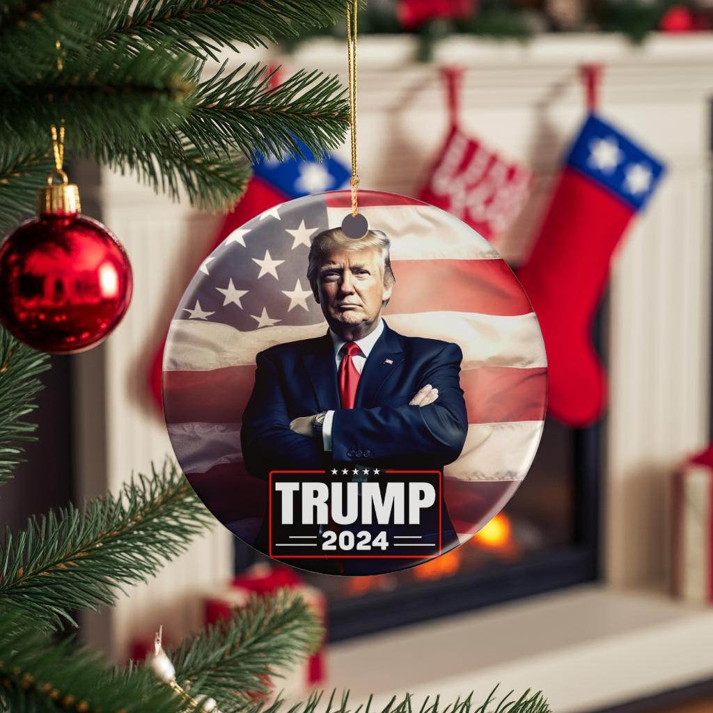 Add a touch of patriotic spirit to your holiday decorations with the Trump 2024 Ornament! Made from high-quality MDF material, this 3 inch diameter ornament features a bold design that proudly displays your support for our great nation. Celebrate and inspire with this must-have addition to your Christmas tree.