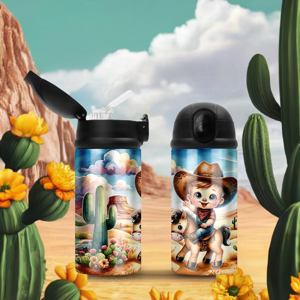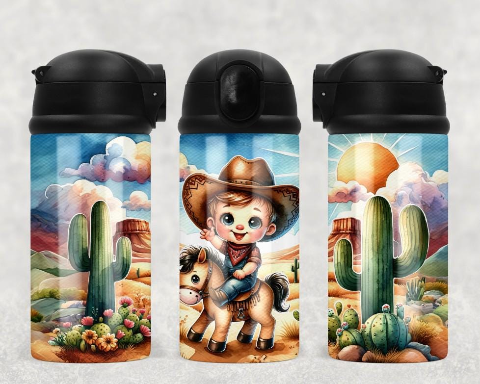 Yeehaw! Keep hydrated while wranglin' with this Little Cowboy Water Bottle. Holds 12 oz of water, made from stainless steel for durability. Fliptop lid makes it easy to sip on the go. Ready to use in just two days. Giddy up!