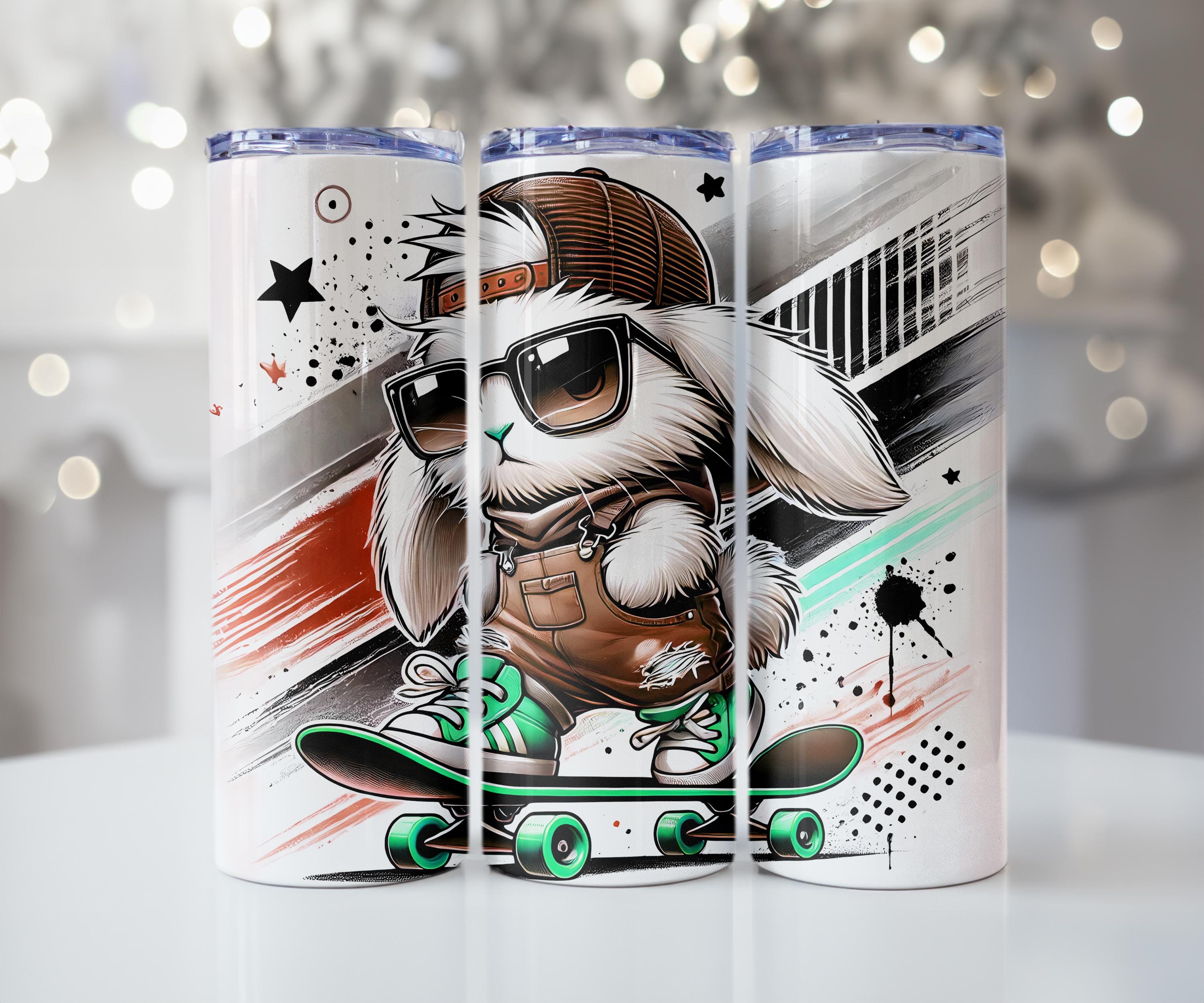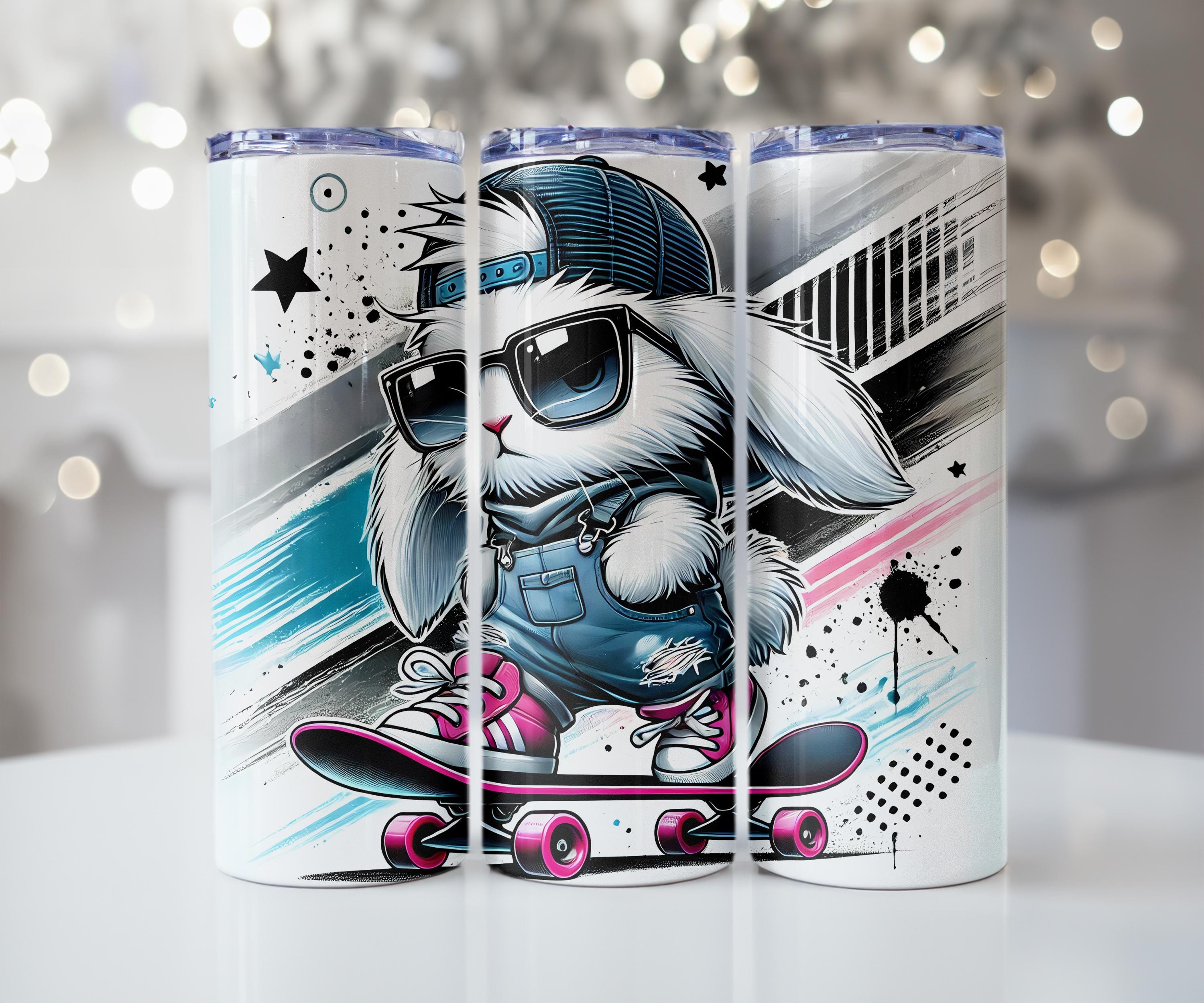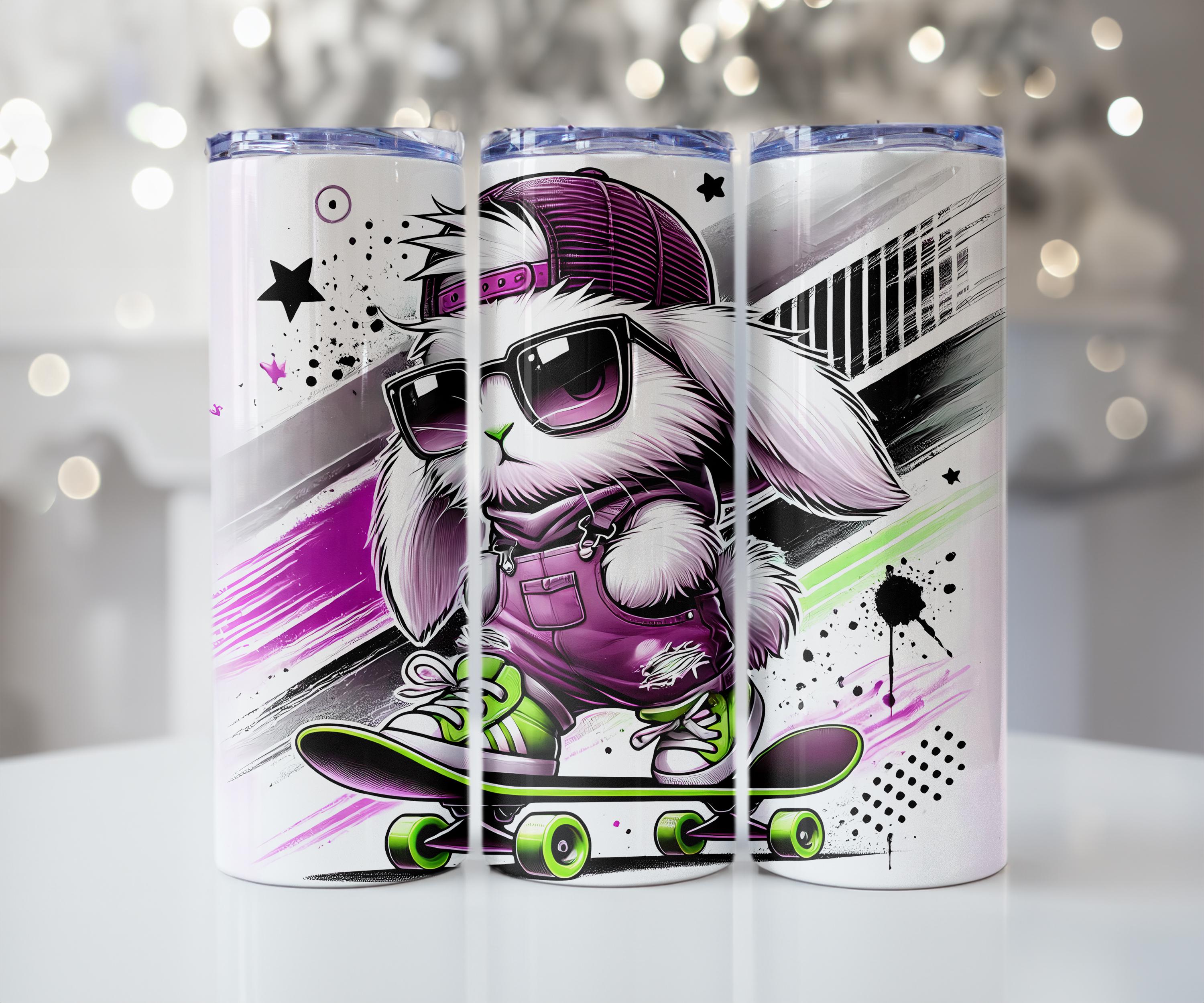 Sip in style with our Skater Bunny Tumblers in 6 vibrant colors! These 20 oz stainless steel tumblers come with a lid, metal straw, and cleaning brush for convenience. Perfect for keeping drinks hot or cold on the go. Hop on over to funkytown with these quirkily designed tumblers.
