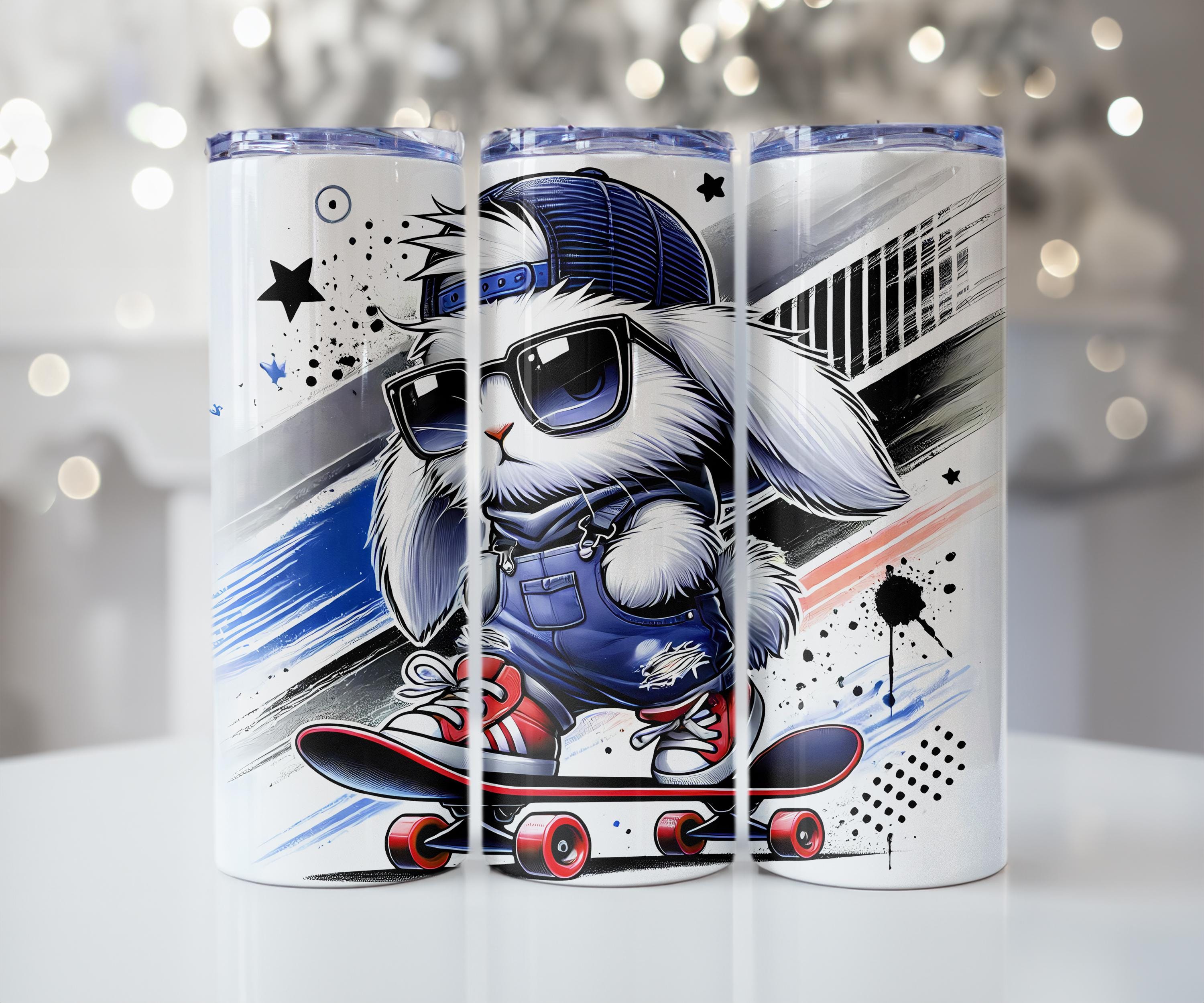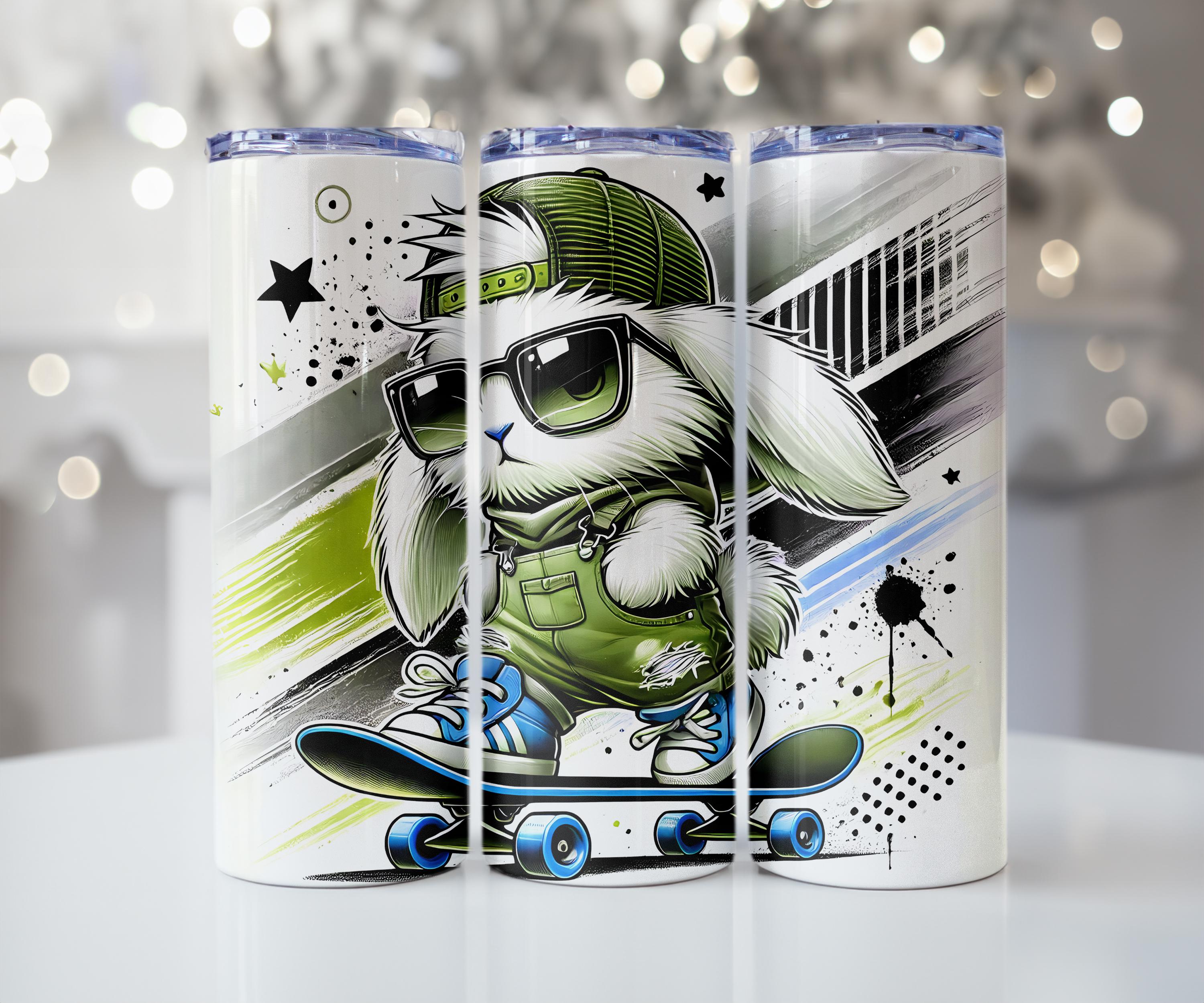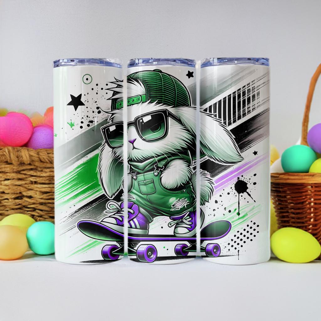 Sip in style with our Skater Bunny Tumblers in 6 vibrant colors! These 20 oz stainless steel tumblers come with a lid, metal straw, and cleaning brush for convenience. Perfect for keeping drinks hot or cold on the go. Hop on over to funkytown with these quirkily designed tumblers.
