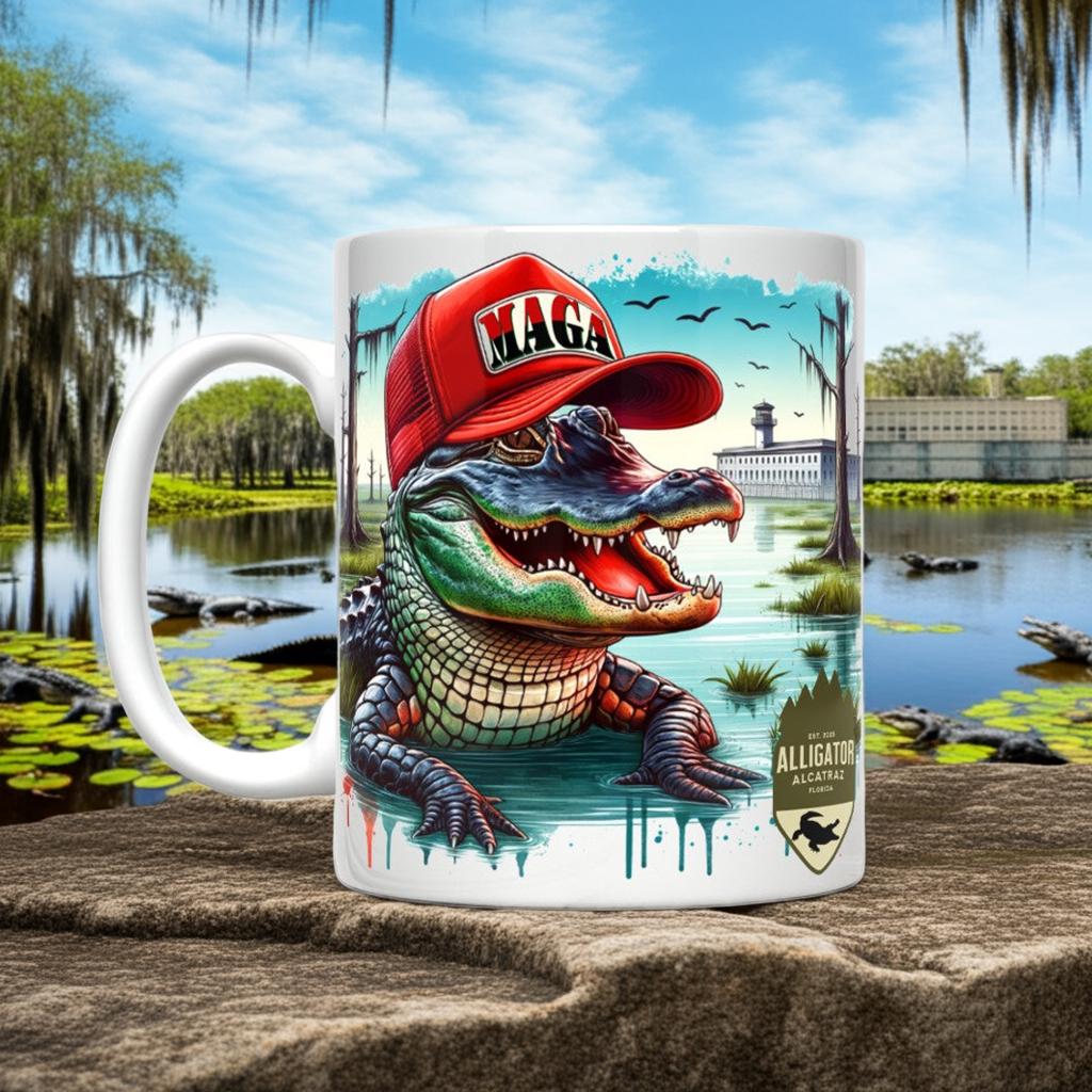 Enjoy your favorite beverage in the bold MAGA Alligator Mug, available in 11 oz or 15 oz sizes. Crafted from durable ceramic, it’s both microwave and dishwasher safe for everyday convenience. Made and shipped within 2 business days, this mug combines practicality with a statement design, perfect for showing your spirit while enjoying your coffee or tea.