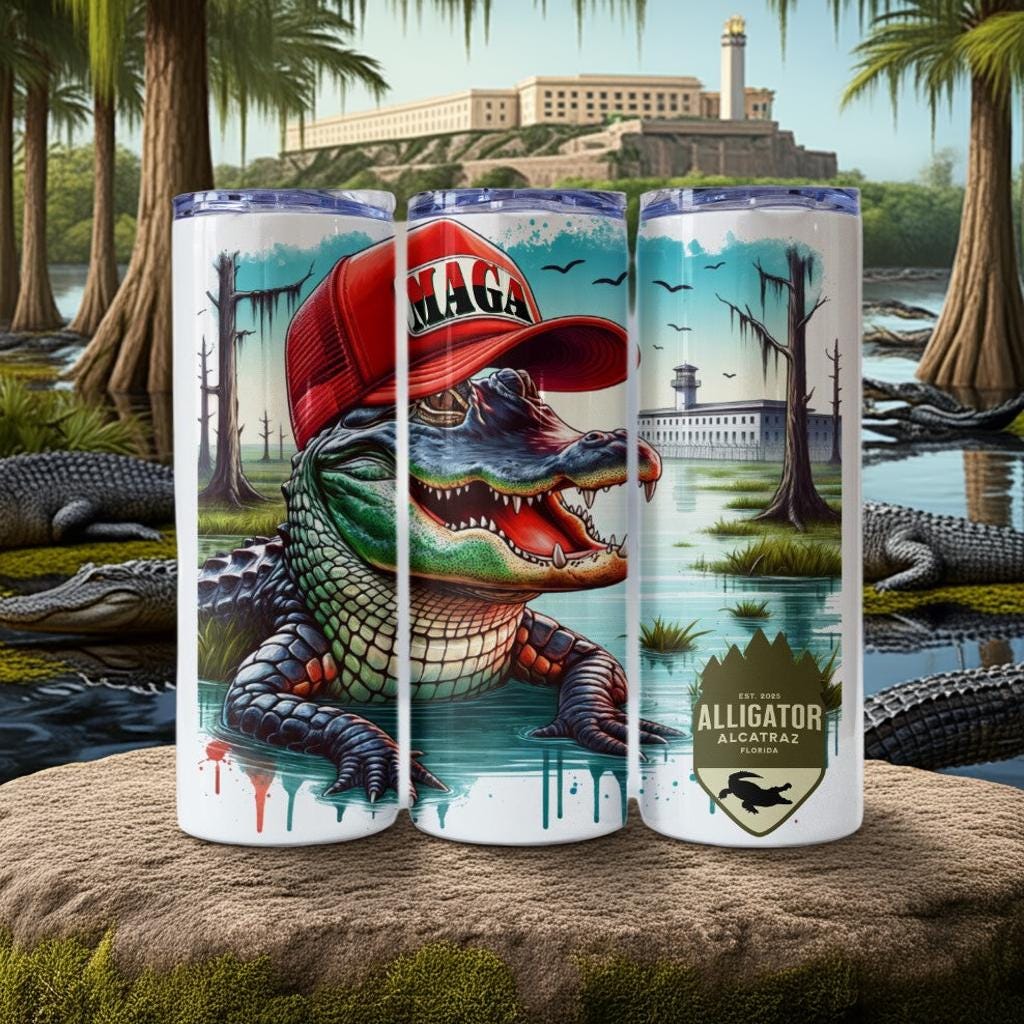 The MAGA Alligator Alcatraz Tumbler commands attention with its daring design and practical features. Crafted from stainless steel, this 20 oz tumbler keeps your beverages at the perfect temperature. It includes a sturdy plastic lid, a sleek metal straw, and a cleaning brush to maintain every detail. Ready for any adventure, it’s the ultimate statement piece for those who live boldly.