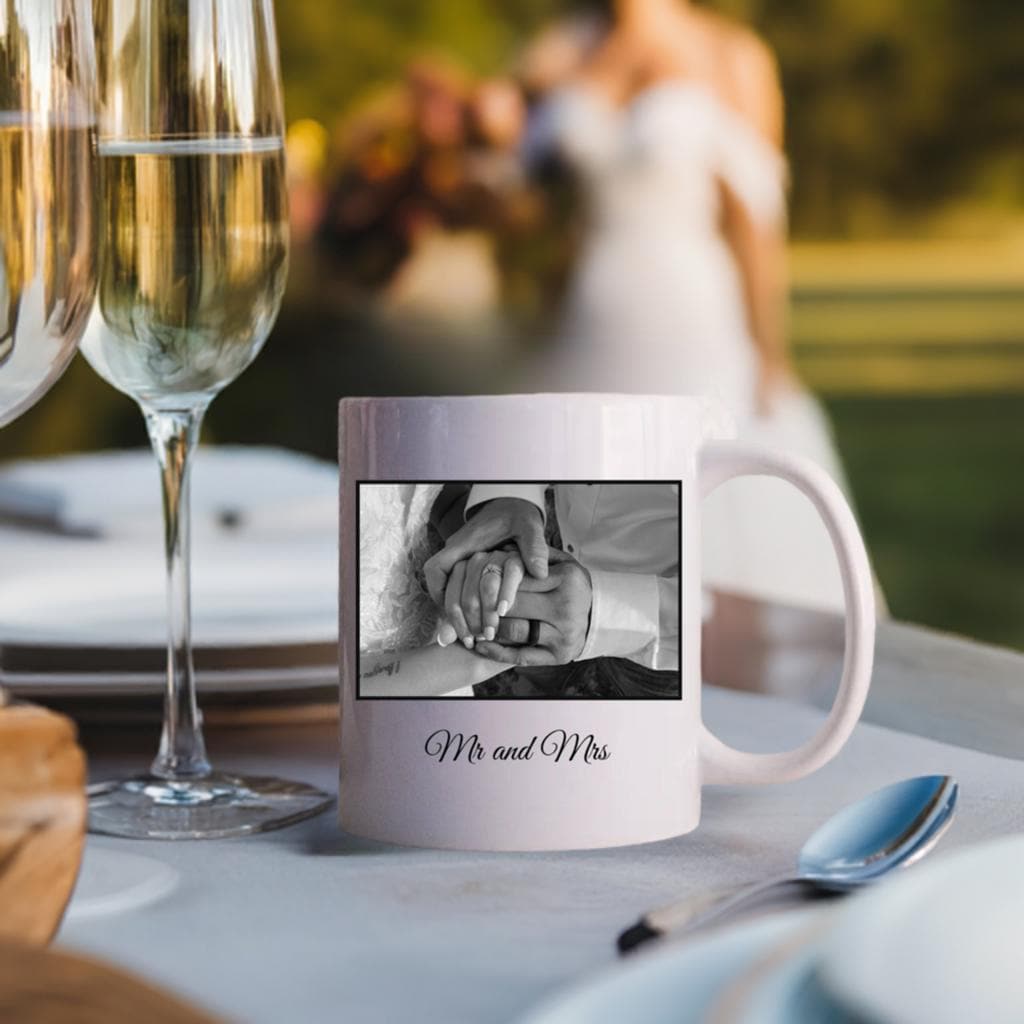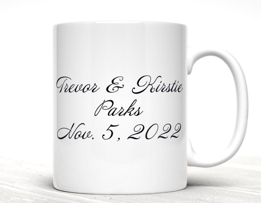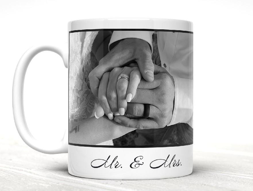 Celebrate your special day with our customizable wedding mug! Made of durable ceramic, this 11 or 15 oz coffee mug is both microwave and dishwasher safe. Personalize it with a photo, names, and wedding date for a unique and memorable keepsake. Cheers to a love that lasts forever!