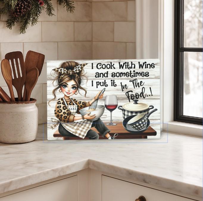 Indulge your love of cooking and wine with this one-of-a-kind cutting board. Comes with a stand to display in the kitchen. Whether you're slicing and dicing ingredients for a gourmet meal or simply enjoying a glass of your favorite vintage, this board adds a touch of humor and personality to your kitchen. It's the perfect gift for the home chef who knows that cooking and wine make the perfect pairing.