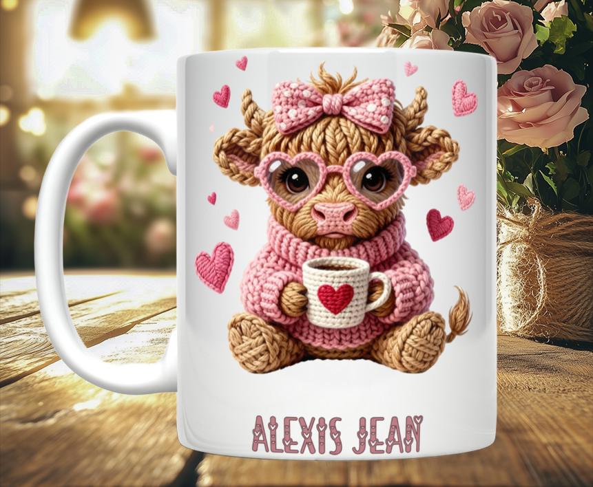 Each mug features a beautifully designed Highland cow dressed in a cozy sweater, adding a touch of whimsy and warmth to your daily routine. Customize it with a name or a special message to make it truly unique and personal.
